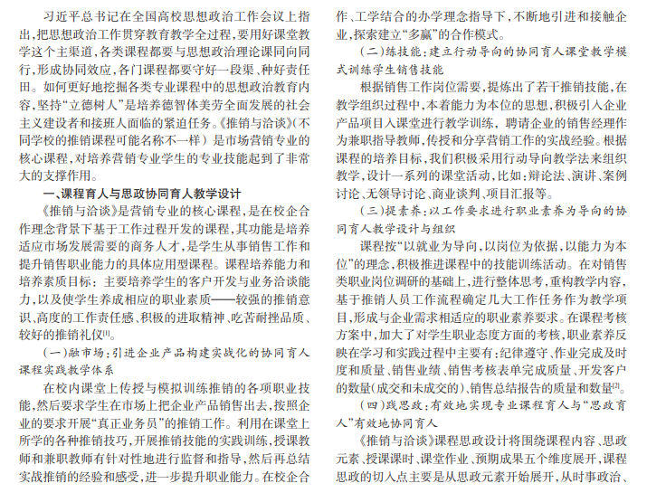 实施课程思政改革,是落实立德树人任务、将社会主义核心价值观融入教书育人过程的重要举措。高职市 场营销专业人才培养的职业素养要求和思政育人有着很强的协同效应,特别是在《推销与洽谈》课程中显得尤为明显, 本课程的专业能力培养和职业素养的提升与“课程思政”的协同效应在教学过程中应得到很好的体现,最终形成课程 “四化”成果。