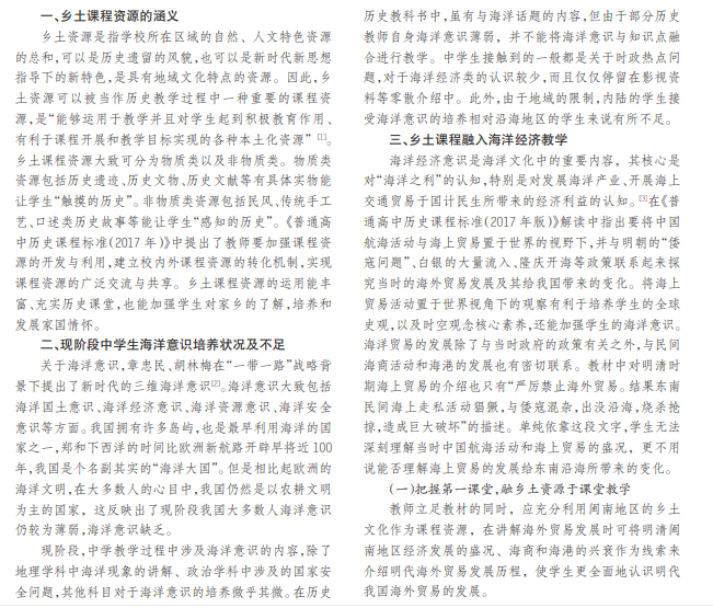 如今,各大国均致力于建设海洋强国,但现阶段中学生海洋经济意识仍较缺乏,中学教育对于海洋经济意 识的培养也较为薄弱。乡土资源贴近学生生活,易引起学习兴趣,在海洋经济意识教学过程中融入乡土资源,既是课程 标准的要求,也有利于加深学生对地方文化的了解,同时深化海洋经济意识。