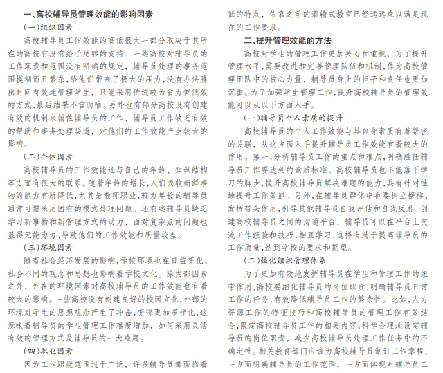 高校辅导员承担着教师和干部的双重身份,在教师队伍中是一个特殊的角色。虽然我国高等教育逐渐大 众化,谈论起辅导员这个职位时,人们通常关注的是辅导员的行政管理职能,但是作为高校管理队伍里不可或缺的一部 分,他们发挥的作用和在队伍中的地位往往被人们忽略,使得辅导员经常忙于繁杂事务,失去了许多自我提升的机会。 高校辅导员应该调整传统的工作模式,注重思维的扩展和工作方式的创新。以学生的需求为中心,高效且针对性地开展 工作,促进辅导员管理效能的提升。