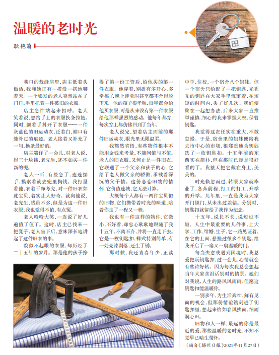 巷口的裁缝店里,店主低着头 做活,我和她正有一搭没一搭地聊 着天。一个银发的老人突然站在了 门口,手里托着一件破旧的衣服。
