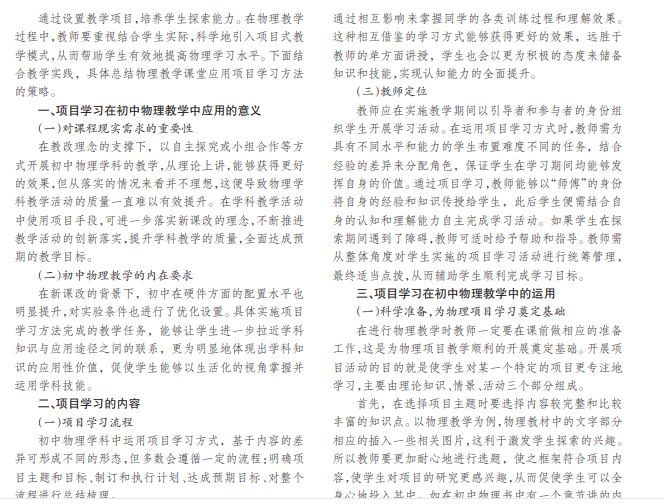 在初中物理教学课堂,运用项目学习方法,有利于提高学生实际学习能力、构建更加高效的教学课堂,从而 不断地提高学生物理实践能力。本文希望通过分析,能够提高物理项目学习方法的应用水平。