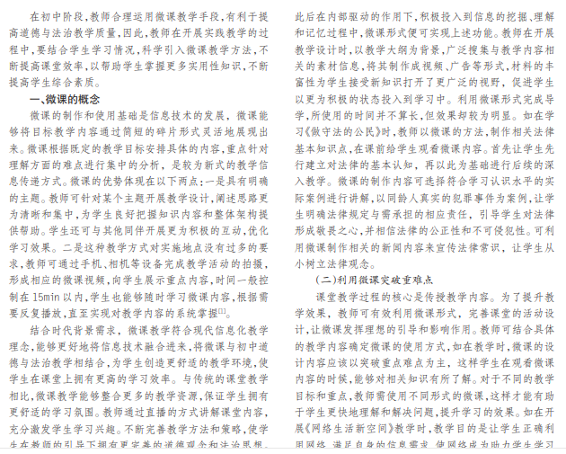 在初中道德与法治教学课堂,为了提高教学效率,教师要重视引入更加高效的教学方法。结合实际,本文研 究微课教学模式,总结了微课在教学课堂应用的具体措施,希望分析能够为不断提高教学水平提供有益借鉴。