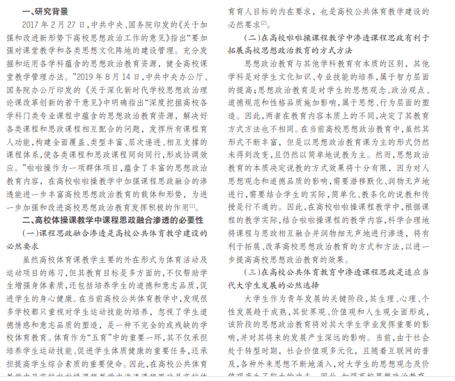 高校思想政治教育工作事关办什么样的大学、怎样办大学的根本问题,事关党对高校的领导,事关中国特 色社会主义事业后继有人,是一项重大的政治任务和战略工程。在高校啦啦操课程教学中,具有开展课程思政融合的必 然性与重要价值。因此,本研究在对其必然性与渗透内容进行深入分析的基础上,对高校啦啦操课程教学中加强课程思 政融合渗透的对策进行探索,为加强高校啦啦操课程教学中课程思政融合的渗透、提高高校思想政治教育的效果提供 参考和借鉴。