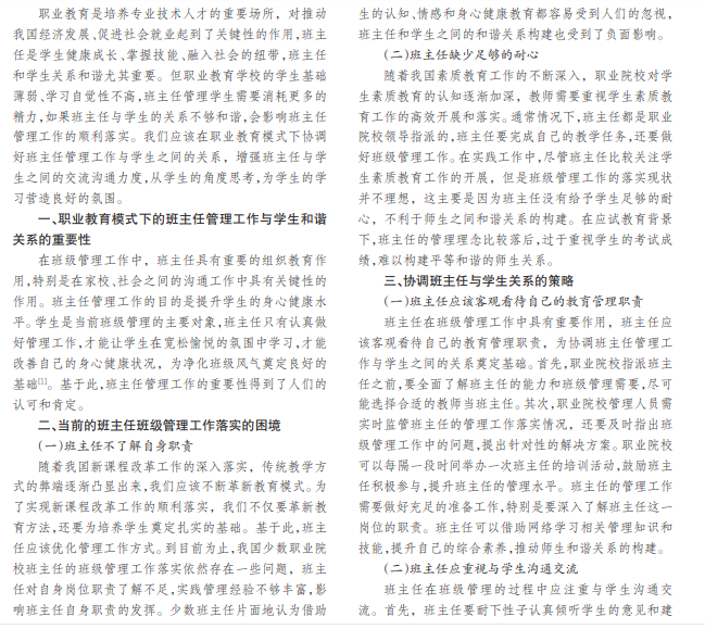 在落实教育工作的过程中,师生关系具有关键性的作用,良好的师生关系有利于教学质量的提升。在职业 教育自身特殊性的影响下,班主任与学生之间的关系直接关系到学生的学习质量和效率,还关系到学生的学习热情。职 业教育模式中班主任管理工作与学生之间的关系至关重要。