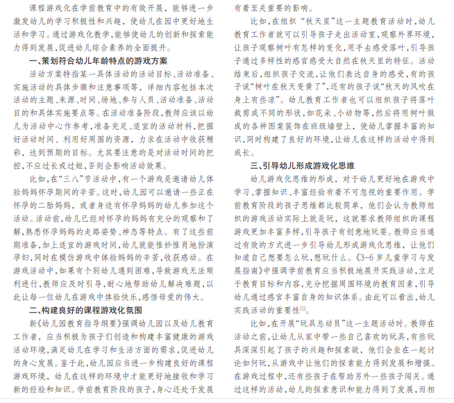 当前教育部门对学前教育提出了更高的要求和标准,强调幼儿教育工作者在保障幼儿在园身心安全的同 时,也应当开展多样性的教育教学活动,促进幼儿综合素养的全面发展,要求幼儿园应当积极地展开游戏活动,幼儿教 育工作者应当充分认识游戏对幼儿发展的重要性,积极地开展课程游戏化,进一步促进幼儿的身心发展。