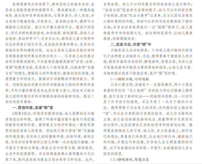 幼儿利用废旧材料自制棋类游戏是一个循序渐进的过程,在这个过程中,幼儿智力得到开发,想象力和创 造力得到提高,也逐渐学会分工合作,团体合作意识有所增强。基于此,本文以中班利用废旧材料自制吴江棋为例,将棋 类游戏与废旧材料相结合,对幼儿园自制棋类游戏进行有益探索,并根据实践从环境创设、教师支持和家园合作三个方 面有针对性地提出创新性运用废旧材料开展棋类游戏的指导策略。
