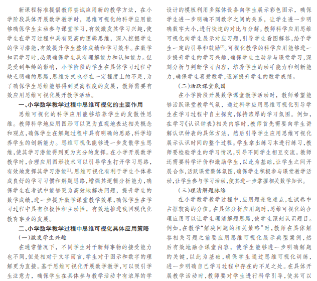 基于思维可视化合理设计教学内容,不仅能够有效地提升学生的学习成绩,还可以进一步培养学生的识图 能力与分析能力。科学应用思维可视化进行数学思维训练,可以确保学生具有更高的理解力和想象力,实现教学质量和 教学效果的有效提升。本文分析在小学数学教学过程中思维可视化的主要作用,以此为基础,综合探究数学课堂教学过 程中实现思维可视化的具体策略。