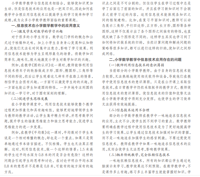 当前信息技术已经应用到各个领域中,在教学中应用信息技术能够丰富教学形式,还能够给学生呈现更加 直观形象的动态效果,让学生能够轻松地掌握数学知识。当前在小学数学教学中,信息技术的应用还存在一定的问题, 因此教师需要深度探讨小学课堂中信息技术应用存在的问题,并采取相应策略,促进教学效果的进一步提升。