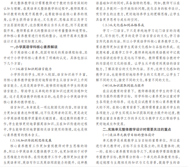 在核心素养视角下开展小学英语单元整体设计时,要从内容整合与多元语境入手,激发学生学习英语的兴 趣。在整个教学设计上,教师也要考虑学生的认知基础,遵循学习的规律进行整体设计,提高个体的核心素养。本文以小 学英语单元整体教学为分析对象,探讨有效的教学设计路径。