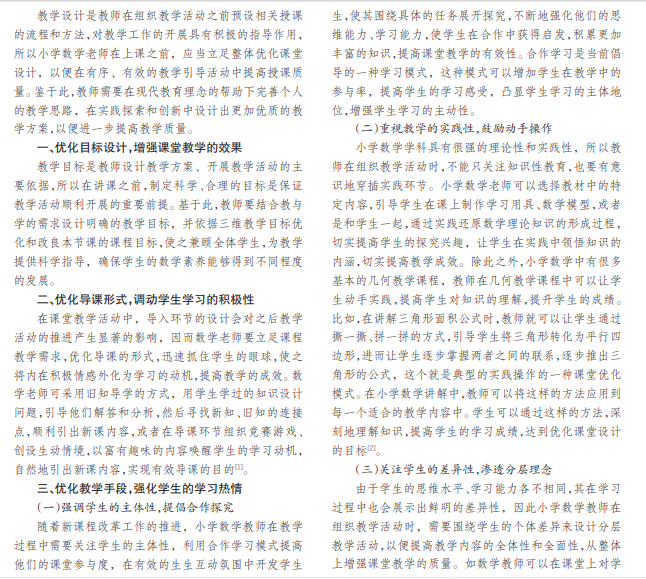 在大力落实课程改革理念的过程中,教育工作者要不断优化教学方式方法,注重打造多元开放的学习环 境,给予学生更加有效的引导,增强本学科的教学质量。本文详细论述优化课堂设计的策略,以期在创新中构建高效的 课堂,促进学生全面发展。
