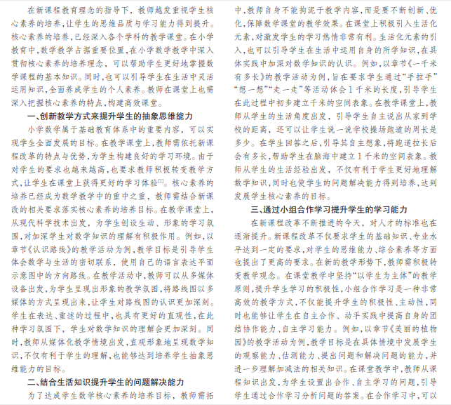 在现代教育理念的指导下,教师的教学设计需要立足于核心素养,为学生的全面发展奠定基础。教师在课 堂教学中,需积极创新教学方式,为学生构建出更加高效、舒适的学习环境。本文简要分析立足核心素养,提高小学数学 教学实效的策略。