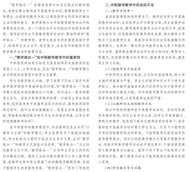 在中职数学教学中采用“教学做合一”,将数学的基本理论与实际操作、实际生活相结合,可以有效地培养 学生自主创新能力和主动探索的精神。本文将从“教学做合一”的重要性,教师如何利用“教学做合一”提高中职生的数 学学习能力和应用能力两方面展开论述。
