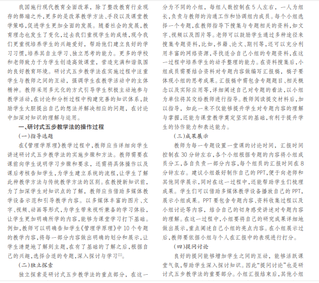 研讨式五步教学法具有较强的实践性,符合当代大学生的心理特点和教育学规律,应用于《管理学原理》学 科的教学活动中不仅能够提升学生的学习积极性,还能全面提升学生的综合能力和思考能力。本文将详细阐述《管理学 原理》教学活动中研讨式五步教学法的应用步骤与应用价值,希望能为教育相关研究人员提供参考和借鉴。