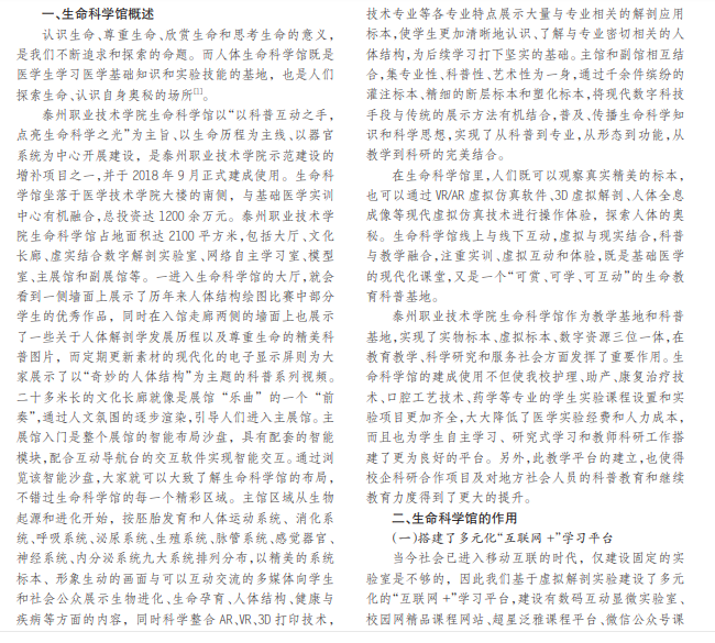 本文以泰州职业技术学院生命科学馆为例,简单阐述生命科学馆在解剖学教学、科学研究、服务社会中的 作用。一个设计科学、布局精细、拥有配套信息化平台的生命科学馆的建成和使用,进一步优化整合了教学资源,教学效 果得到了提升,教改教研得到了进一步深化,健康宣教得到了广泛的推进,更好地服务地方发展。