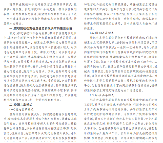 现代社会经济的不断发展对我国高等教育提出了更高的要求,高职院校在档案管理的过程中,科学构建 资源共享模式具有极其重要的价值,相关人员必须加强对档案信息资源共享模式的重视,使档案信息资源实现更高程 度的共享。本文分别从实现机制、规范标准、网络安全防范和组织协调机制四个方面综合探究资源共享模式构建策略, 希望能够推进相关工作的进一步发展。