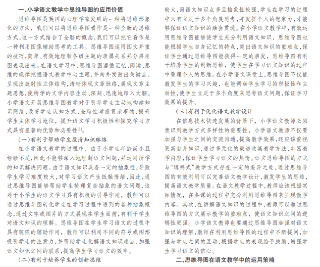 随着时代的进步与社会的发展,人们的学习方式相较于以往发生了很大的改变,教育教学的表现形式正 在变得越来越丰富,思维导图的教学方法则是通过绘图的方式将知识与知识联接起来,进而形成一个相对比较完整的 知识体系,可以从一定程度上提升学生的认知能力、学习能力以及理解能力。本文旨在通过对思维导图在语文教学中的 运用进行研究与分析,进而提升语文学科的教学效率。
