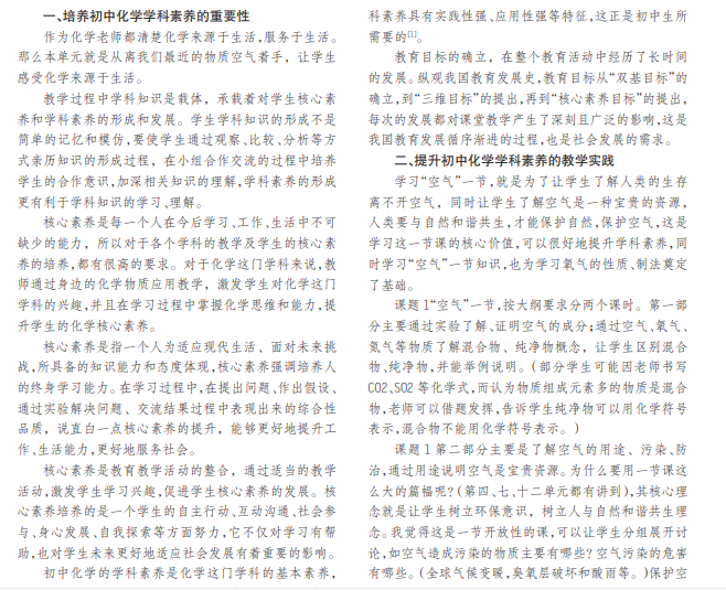 人教版化学第二单元从我们身边的物质空气入手,重点从化学的角度学习氧气的性质、制法。学习本单元 首先老师要搞清楚为什么要学习空气、氧气的性质与制法,让学生清楚学习本章的核心价值及意义。通过身边的物质学 习,激发学生学习化学的兴趣,提高学习素养。初中化学的核心素养,是学生在学习的过程中产生的能够利用所学化学 知识解决相关化学问题的思维与能力,要求化学老师在传授好化学知识的同时,培养和提高学生学习化学的核心素养。