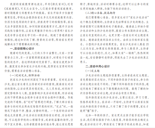 随着时代的进步与发展,家庭教育越来越被重视。新时期家长教育水平提高,接受多元化教育信息,但因阅 读的片面化、单一性等,让家长无法多面获取信息,家长沙龙顺应时代而生。家长沙龙规避了普通讲座的枯燥性,通过知 识的了解、情景的互动等,帮助家长更好地解决当下需要解决的问题。教师精心设计、定主题,加强主题的系列性与活动 性,家校携手,并肩而行,培养拥有积极向上精神状态与健康心理品质的孩子。