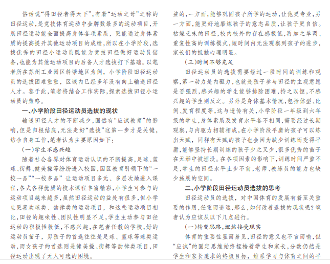 田径运动虽有“运动之母”之称,但是在小学阶段,由于学生对田径运动不感兴趣、家长不予支持、训练时间 也不够充足,加上应试教育的影响,田径运动员的选拔困难重重。笔者结合工作实际,探索提出选拔的有效途径。