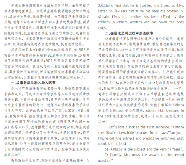 《英语课程标准(2011)》强调了语言学习的实践性和应用性,提倡学生在语境中体验、理解和运用语言。为 调动学生的学习积极性,实现以学生为本的语法课堂,教师可将生动的故事融入语法教学中。在本文中,笔者以宾语从 句教学为例,分析和探讨故事情境在初中英语语法教学中的应用。