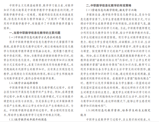 随着教学改革进程的不断深入,信息技术逐渐被应用到教学领域中,中职数学信息化教学可以有效激发 学生数学学习兴趣,提高中职课堂数学教学质量。本文就信息技术在中职数学教学中的应用进行探究。