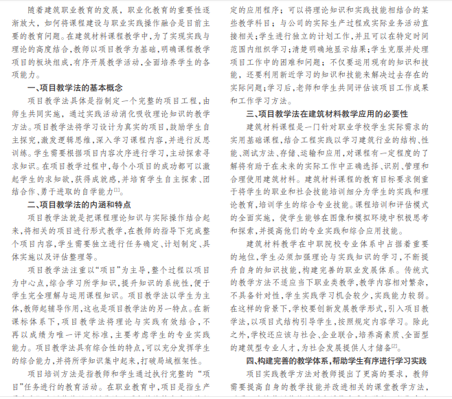 在建筑材料课程教学中,为了培养学生的职业技能,实现课程与职业发展的协调,教师可以应用项目教学 法,提高学生的学习兴趣和学习效率。当下,项目教学法在建筑材料课程教学应用中还存在着一些问题,为了保证教学 质量,教师必须深入了解探究项目教学法的概念,并不断优化教学结构,为教学和科研提供帮助。