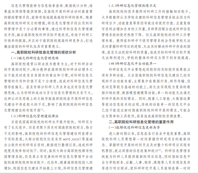 随着社会的发展,我国高等职业院校科研水平及实力有了大幅度提升,科研成果开始被应用于国计民生之 中。将信息化管理技术应用到新时期高职院校科研开展之中,能够有效地促进高职院校科研迈向正规化、系统化,更有 利于实现科研开展时的人员管理、经费统筹及项目协调,对促进高职院校科研长效发展具有重要价值和意义。本文将从 高职院校科研信息化管理的现状及作用入手,对高职院校科研信息化管理建设的途径及注意事项展开分析论述。