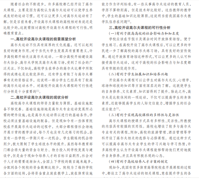 高尔夫的运动方式是比较休闲的,可以使人们能够更加轻松愉快地运动。高校开设高尔夫课程可以丰富 原有的教学课程,能够帮助学生养成良好的运动习惯的同时提升学生的自身素养。高校开设高尔夫课程的经验还是比 较缺乏的,需要探讨高尔夫课程开设的可行性与教育要点。