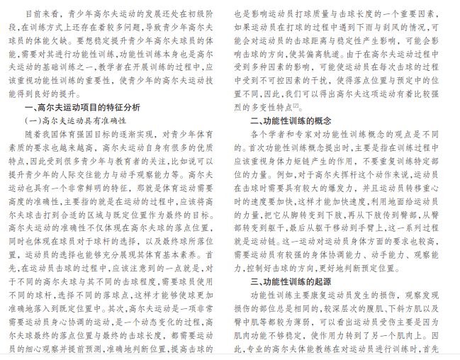 功能性训练是比较新鲜的训练方式,这种训练形式受到很多运动专家与教练的重视,广泛应用在各个领域的体 能训练中。对于青少年高尔夫体能训练来说,对其进行功能性训练可以使球员更加积极主动地练习,提升其高尔夫球技。