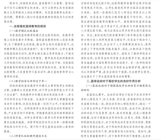 随着社会的不断发展,对高校篮球教育的要求也变得越来越高。篮球教育不仅可以使学生的体质得到增 强,还可以促进学生的全面发展。但是现如今,我国高校在篮球教育发展的过程中,普遍存在一些问题,为了能够使篮球 教育的水平得到提高,就需要分析存在的不足,并提出相应的发展对策,使高校篮球教育工作顺利进行。