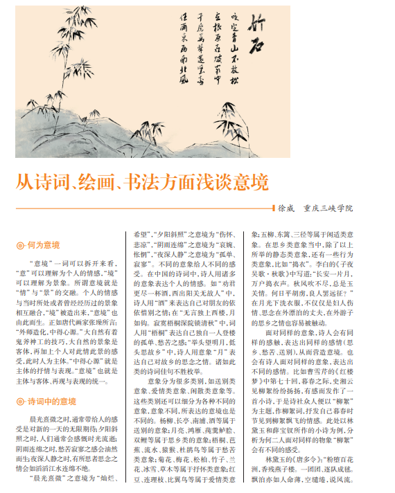 “意境”一词可以拆开来看, “意”可以理解为个人的情感,“境” 可以理解为景象。所谓意境就是 “情”与“景”的交融。个人的情感 与当时所处或者曾经经历过的景象 相互融合,“境”被造出来,“意境”也 由此而生。正如唐代画家张璪所言: “外师造化,中得心源。”大自然有着 鬼斧神工的技巧,大自然的景象是 客体,再加上个人对此情此景的感 受,此时人为主体。“中得心源”就是 主体的抒情与表现。“意境”也就是 主体与客体、再现与表现的统一。
