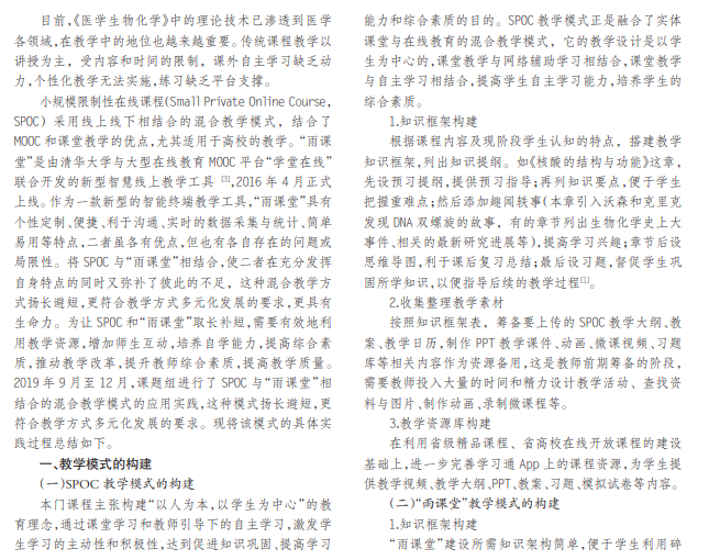本课题组进行了 SPOC与“雨课堂”相结合的混合教学模式的应用实践,分别构建了 SPOC和“雨课堂”的知 识框架,收集和整理教学素材,构建了知识库,含前期准备、设计实施、效果评估三个阶段,这种模式扬长避短,更符合教 学方式多元化发展的要求,能给学生更好的学习体验,具有深刻的理论和实践意义。