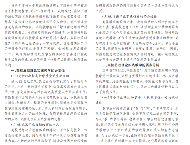 本文结合当前高校思政理论课程的教学实际,就相关工作开展的必要性及优化措施展开分析,以期为今 后高校教育工作的升级以及高素质人才的培养做出有价值的参考。