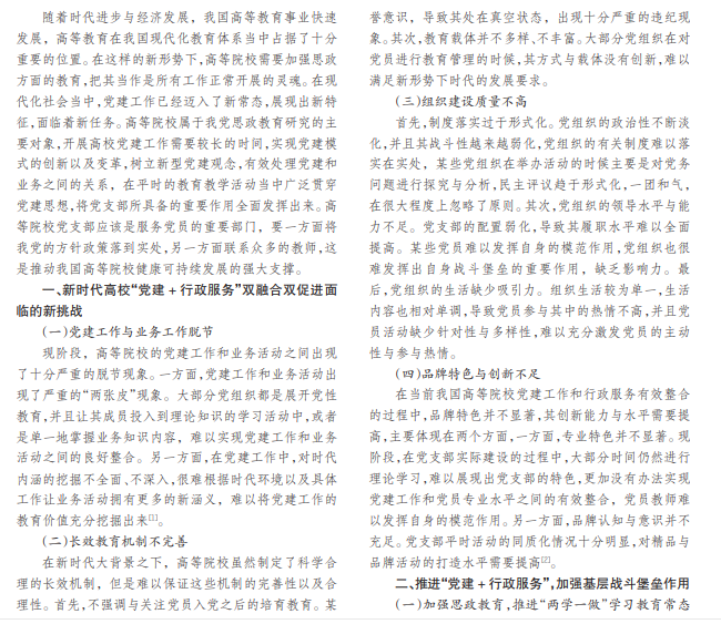 在新时代大环境下,高等院校的党建工作面临着一系列挑战,需要采取科学合理的措施与方法,实现“党建+ 行政服务”之间的良好融合,让两者互相促进与推动。在平时的教育教学活动当中广泛贯穿党建思想,全面发挥党支部 的重要作用。基于此,本文就新时代高校“党建 +行政服务”双融合双促进展开深入全面的探究分析,期望可以为将来的 研究提供科学合理的参考。