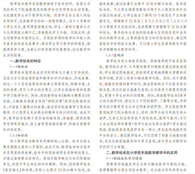 新课改背景下,我国的教育体制不断进行革新,促使小学数学低年级教学的模式发生相应改变。将绘本应 用在具体的课堂教学中,能够提高学生的学习兴趣,培养其数学思维以及分析、解决问题的能力,助力学生扎实掌握基 础的理论知识,提高学习效率。本文主要研究绘本在小学数学低年级教学中的有效应用方式。