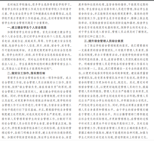 校园安全是学校教育教学工作正常开展的基本保障,寄宿学生的安全问题是寄宿制学校的重中之重,对 于寄宿学生进行安全管理是十分重要的。本文针对目前寄宿学校在寄宿学生安全管理方面存在的问题,提出一些针对 农村寄宿制学校寄宿学生的安全管理策略。
