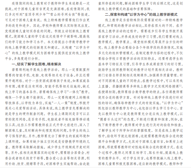 2020年受疫情影响,线上教学成为居家学习的必要途径。为给疫情防控下困难儿童提供更加合理高效的 线上教学环境,提高疫情下困难儿童的学习水平,需要创新线上教学模式,构建适应困难儿童的线上教学模式,做到“停 课不停学”。