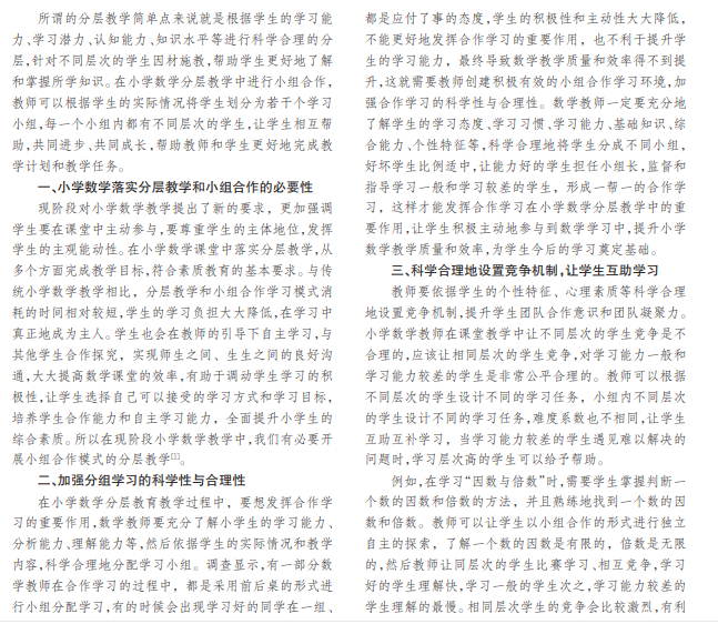 随着新课程改革的逐渐深入和发展,要求素质教育要面向全体学生。教师在教学活动中要依据学生的实 际情况和教学内容,重视学生的个性特征和个性差异,为了更好地完成这一教学目标,在课堂教学中要科学合理地借助 小组合作模式开展分层教学,激发学生学习兴趣,帮助学生更好地了解和掌握所学知识,提升教学质量和教学效率。文 章针对小组合作构建小学数学分层教学进行阐述。