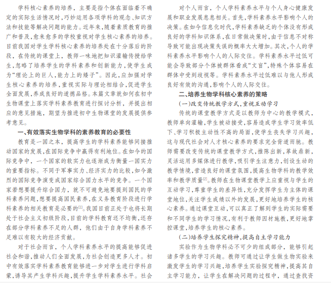 初中生物的核心素养是学生在学习生物知识后自身应该具备的能力与品格,在社会活动、经济活动、生产 实验活动中所形成的生物科学概念,提升自身探究科学的整体能力。培养学生的学科素养能够帮助学生树立正确的人 生观、价值观,生物学科作为初中教学较为重要的组成部分,对学生的学习发展有着重要的作用。故本文对如何培养学 生生物学科核心素养进行分析研究。