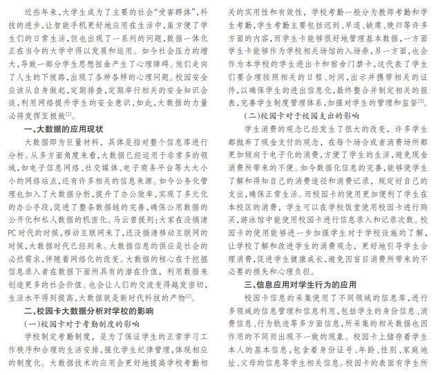 随着信息科技的不断发展,学校科技化进程也在不断地进步和完善,校园卡或一卡通等多种一体化信息服 务出现在了各高校中,越来越多的学生愿意通过一张简单的卡片进行自我管理和消费。校园卡的使用为学校的精细化 管理提供数据支持,为学校管理体系的健全奠定基础,实现数字化在校园中的应用。