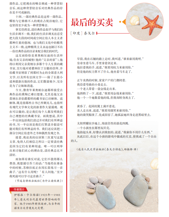早晨,我在石铺的路上走时,我叫道,“谁来雇用我呀。” 皇帝坐着马车,手里拿着剑走来。 他拉着我的手,说道,“我要用权力来雇用你。” 但是他的权力算不了什么,他坐着马车走了。