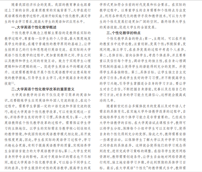 英语是现阶段国际交流的重要语言之一,因此,近年来,我国政府和相关的教育部门也逐渐开始重视大学 英语课程教学,考虑到不同学生不同专业的实际需求,很多大学都进行了英语课程的个性化教学改革,在很大程度上也提 高了我国大学英语教学的水平。基于此,文章就大学英语个性化教学改革的重要意义以及改革措施进行分析。