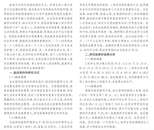 本文探讨如何将思政教育融入到外科护理课程中,有没有更好的方法和切入点,让学生更好地在外科护 理学课程中感受思政教育。选用我校 2018级 20名护理学专业的学生作为研究对象,分成 Z组和 L组,每组 10名,具体 方式在正文中有所叙述。记录两个组的学生平时学习情况,最后从小组笔试考试和思政总结两方面记录学习成绩。结果 显示,接受新教学的 L组学生成绩比接受传统教学方式的 Z组学生分数要高许多,积极性也提高很多。新的教学方式能 更好地将思政教育融入到外科护理课程中,应该多加推广。