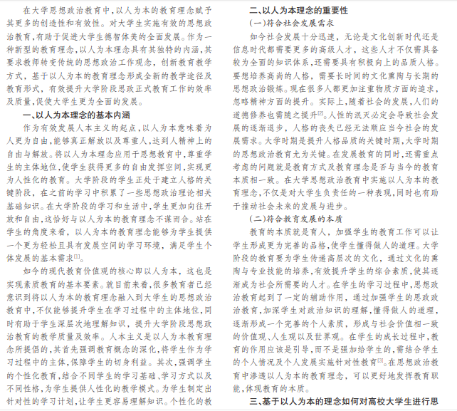随着社会经济的飞速发展,社会各个领域对人才的需求量也越来越大。作为祖国未来发展的希望,大学生 是社会尤为珍贵的人才资源,加强大学生的思想政治教育十分重要。本文先简单概述以人为本理念的基本内涵与重要 性,进一步探究如何在以人为本的教学理念下加强大学生的思想政治教育。
