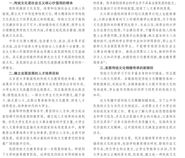 在大学教育中须重视培养大学生的传统文化素养,但是自媒体的兴起,撼动了传统文化的教育作用。高校 应当革新传统文化教育课程体系,并且逐渐健全和完善体系,让大学生体验到中华民族的传统文化,建立起一种高度的 民族文化自豪感。本文就大学生传统文化教育体系创新工作进行了探索和分析,希望能够为相关的教育工作者们提供 一定的帮助和支持。