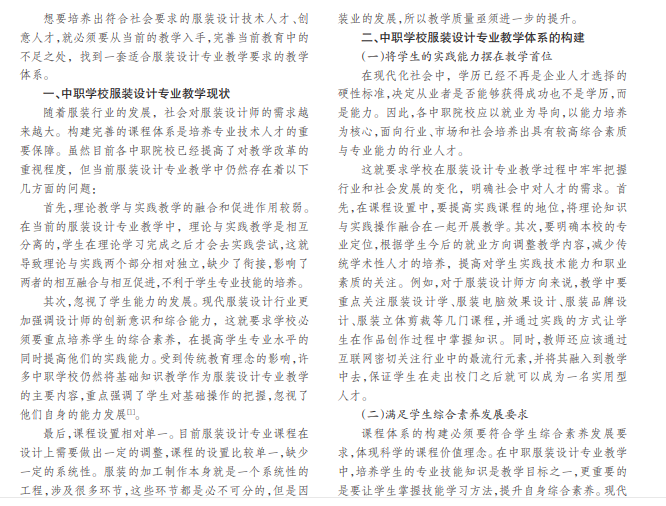 中职学校服装设计专业是培养服装设计人才的主要途径,其教学质量直接影响整个服装行业的发展。本 文从中职学校服装设计专业教学现状入手,具体分析完善教学体系的策略,希望对服装专业教学改革提供帮助。