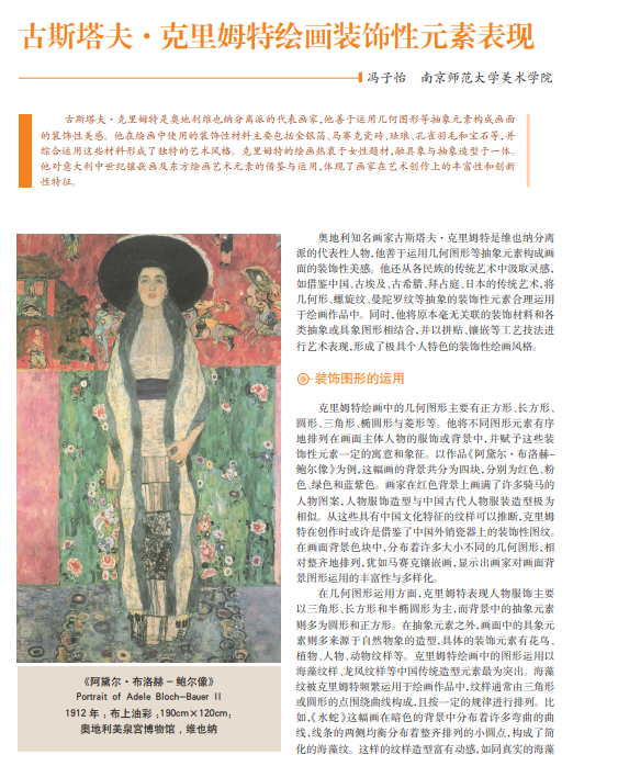 古斯塔夫·克里姆特是奥地利维也纳分离派的代表画家,他善于运用几何图形等抽象元素构成画面 的装饰性美感。他在绘画中使用的装饰性材料主要包括金银箔、马赛克瓷砖、珐琅、孔雀羽毛和宝石等,并 综合运用这些材料形成了独特的艺术风格。克里姆特的绘画热衷于女性题材,融具象与抽象造型于一体。 他对意大利中世纪镶嵌画及东方绘画艺术元素的借鉴与运用,体现了画家在艺术创作上的丰富性和创新 性特征。
