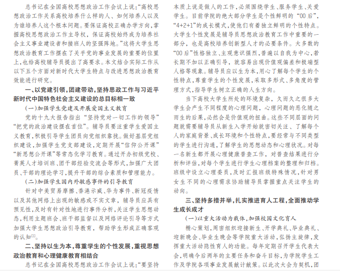 以习近平新时代中国特色社会主义思想为指导,以学院迁址办学为契机,按照“贯彻党的要求、体现时代特 征、满足学生需求、彰显学院特色”的总体思路,本文从坚持党建引领,团建带动;坚持以生为本,尊重学生个性发展;坚 持多措并举,扎实推进育人工程;积极探索新媒体环境下思想政治教育工作新途径和勇担使命对标找差五个方面对新 时代大学生的特点与改进思想政治教育效能进行了研究。以培养具有高尚品德、创新精神和实践应用能力的人才为目 标,不断完善思想政治教育工作规范,提高思想政治教育工作成效,将学生教育、管理、指导与服务有机结合起来。