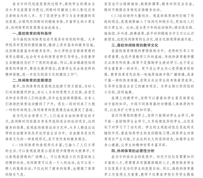 从当今高校体育的发展趋势来看,学生的主观能动性还是比较低的,体育运动不似学习知识那样坐地而 行,它需长久的坚持方能见到效果。高校应重视体育运动,开展一系列的教学活动,引导学生树立体育健康意识,将休闲 体育融入日常生活,着力将休闲体育培养为学生的兴趣爱好,创新现代高校体育文化建设途径。