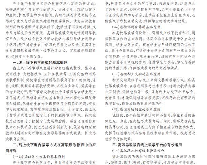 我国正处于高等教育改革的发展时期,思政教育是培养大学生思想道德意识与健全人格的主要教育载体, 随着教育不断地完善发展,高职思政教育备受瞩目。越来越多的教育专家致力于探索契合时代发展与满足学生成长的 思政教育方式。线上线下的教育方式,使高职思政教育迎来了曙光,推动了高职思政教育创新。故此,本文主要概述线上 线下教学形式,说明线上线下混合教学方式在高职思政教育中的应用原则,提出线上与线下结合的教学方法,以期促进 高校思政教育形式创新。
